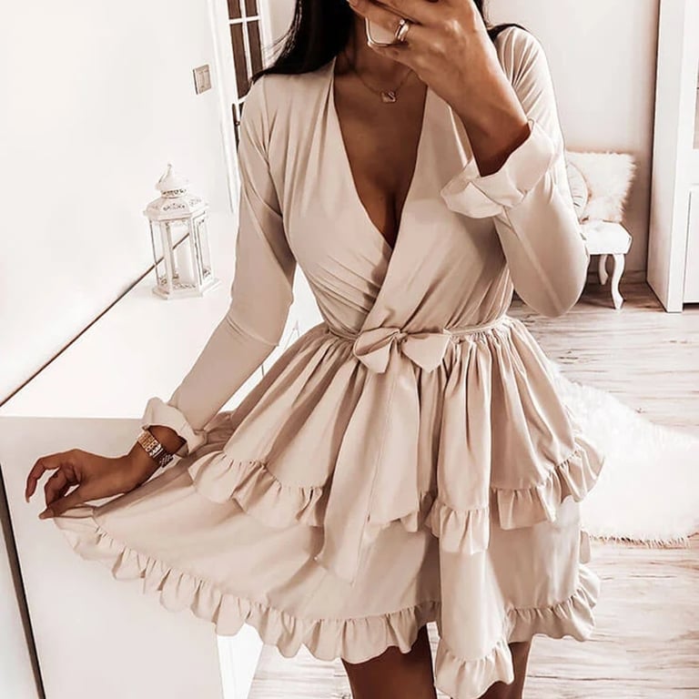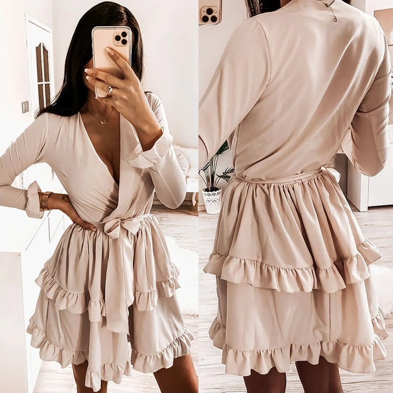 • Con maniche lunghe a volant, scollatura a V profonda, in vita con un elegante fiocco, con due file di volant nella parte inferiore dell'abito.
