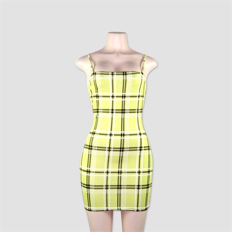 Abito mini estivo giallo con spalline e motivo a quadretti.