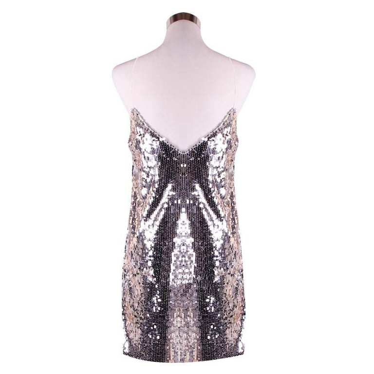 Sexy mini abito in paillettes argento con spalline a spaghetti.