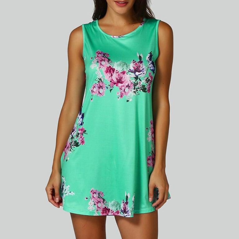 Abito corto da donna con stampa colorata a motivi floreali. Taglio ampio senza maniche con scollatura rotonda. Disponibile in diverse varianti di colore.