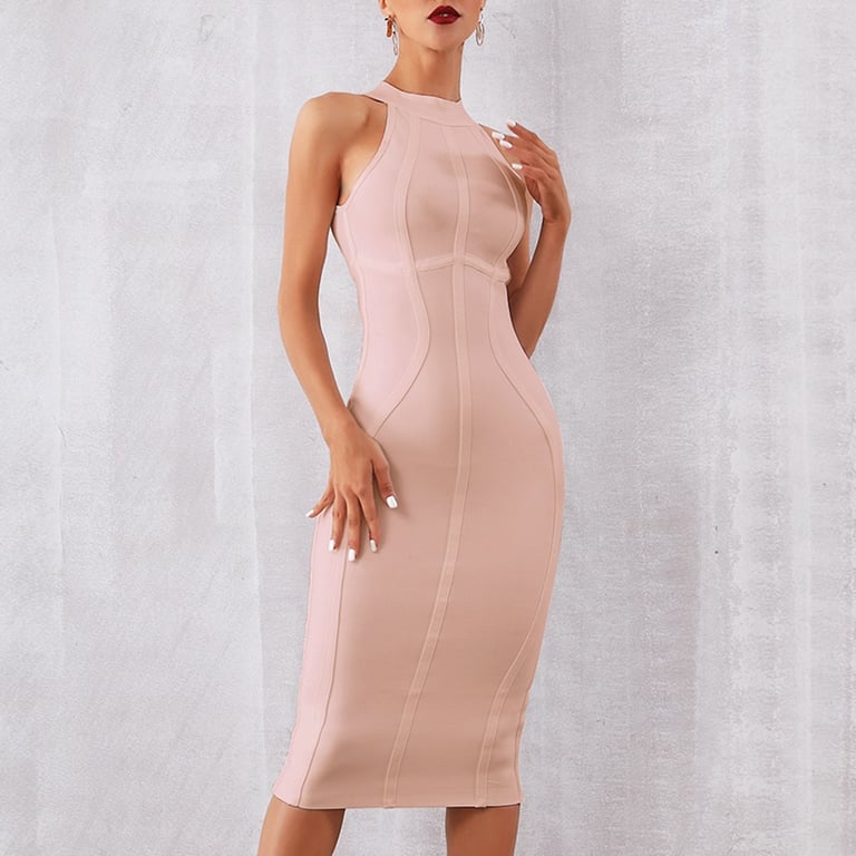 Abito elegante da donna senza maniche. Colletto e lunghezza classica fino al ginocchio.