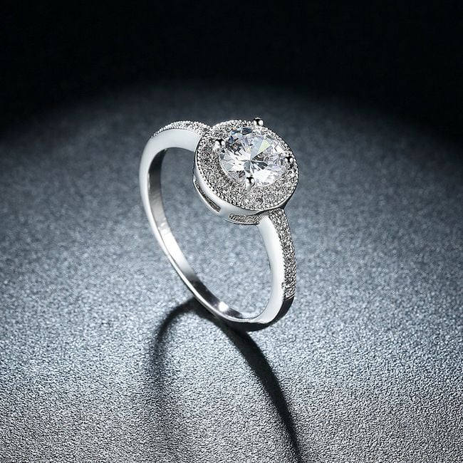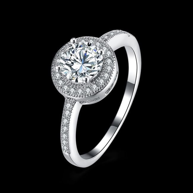 Anello destinato a donne che amano l'eleganza semplice. Il delicato anello completa splendidamente l'abbigliamento festivo e quotidiano. La principale caratteristica dell'anello è una pietra di zirconio posizionata al centro dell'anello. Il bordo attorno alla pietra è decorato con piccoli rilievi. È possibile ordinare in quattro diverse misure.