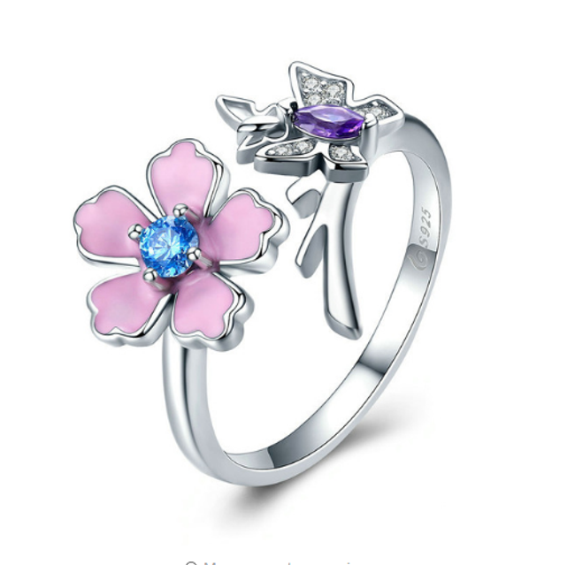 L'anello ha un colore argento ed è arricchito da un fiore rosa e una semplice farfalla. È adatto per l'uso quotidiano e per eventi sociali.