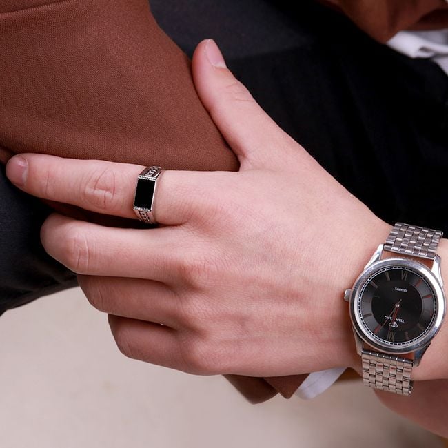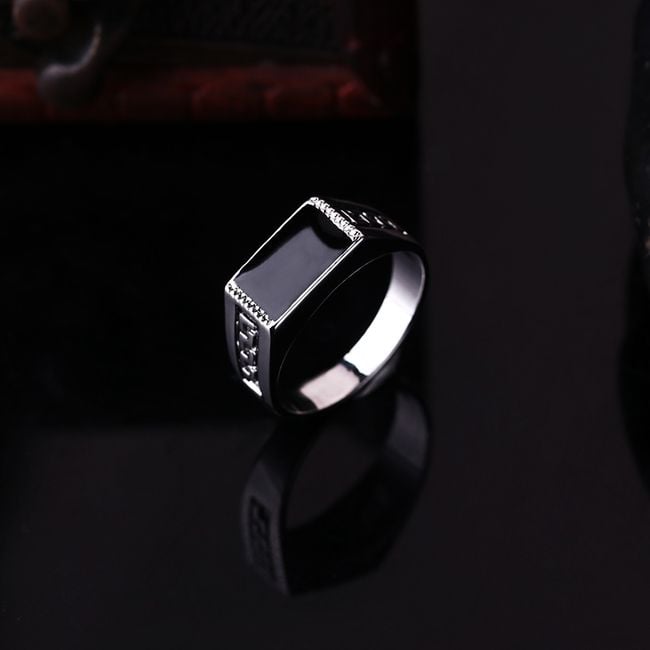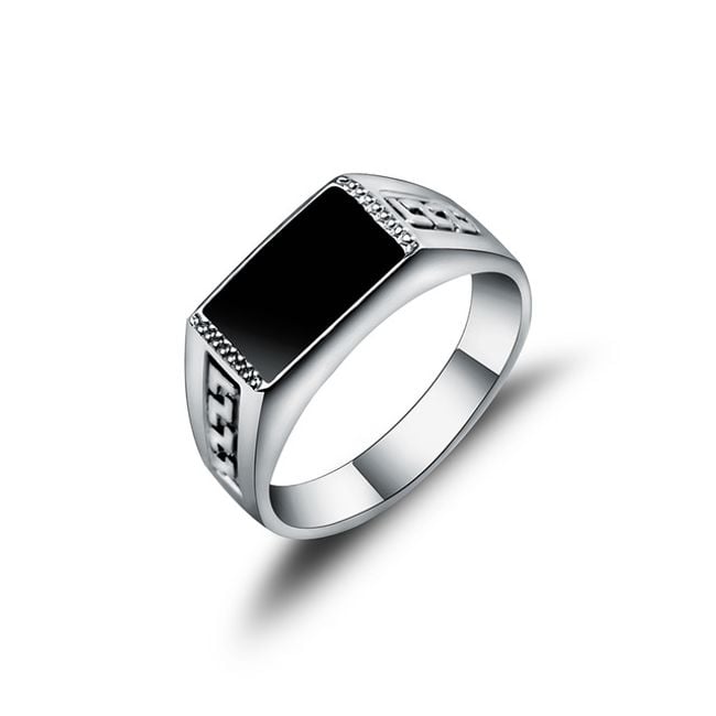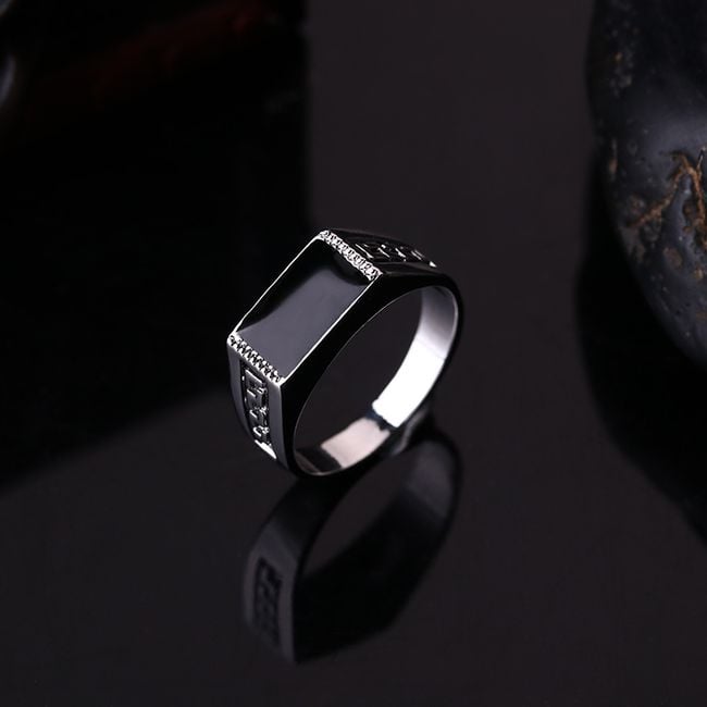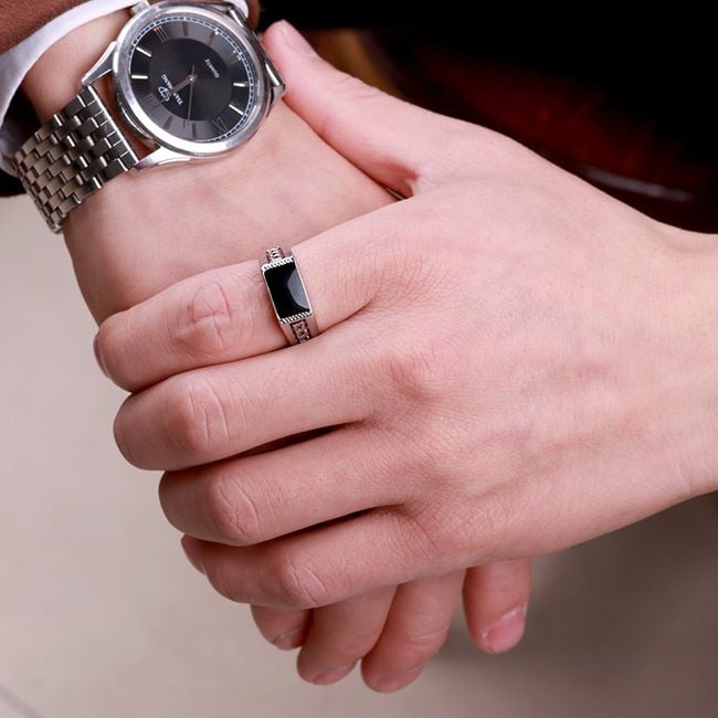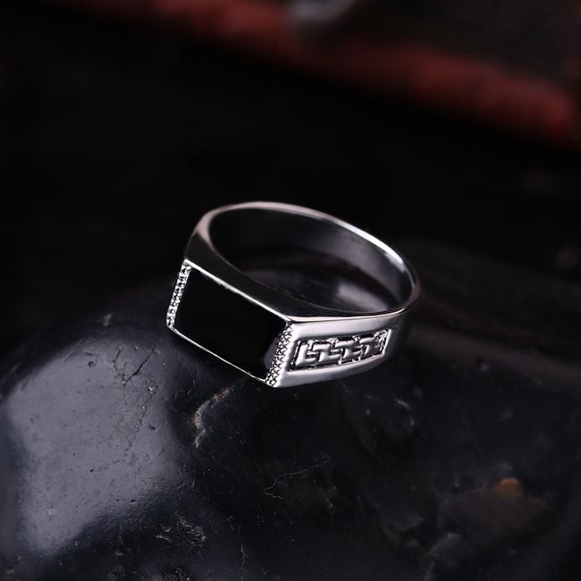 Anello elegante con una massiccia fascia decorato con una pietra a forma di rettangolo.