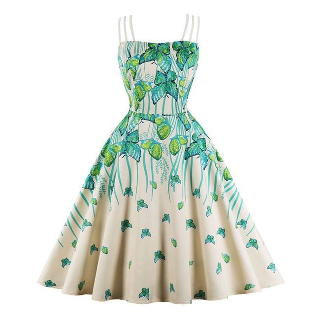 Il vestito è molto bello, ha un colore bianco, arricchito da foglie verdi, blu e turchesi e farfalle, ed è adatto per l'uso quotidiano o eventi a tema.