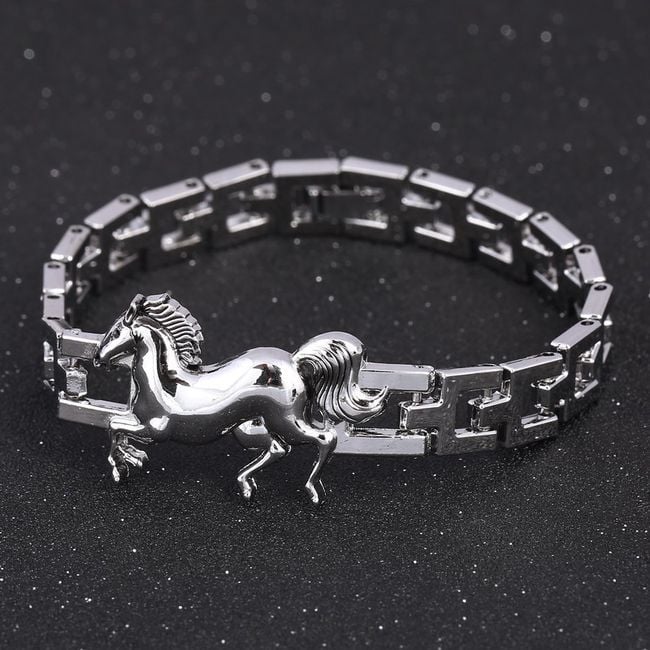 Bracciale color argento con una figura di un cavallo che corre. Questo bellissimo gioiello sicuramente piacerà non solo agli amanti dei cavalli. Adatto anche come regalo per la tua amica, collega, sorella …