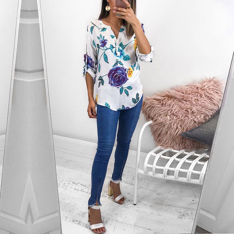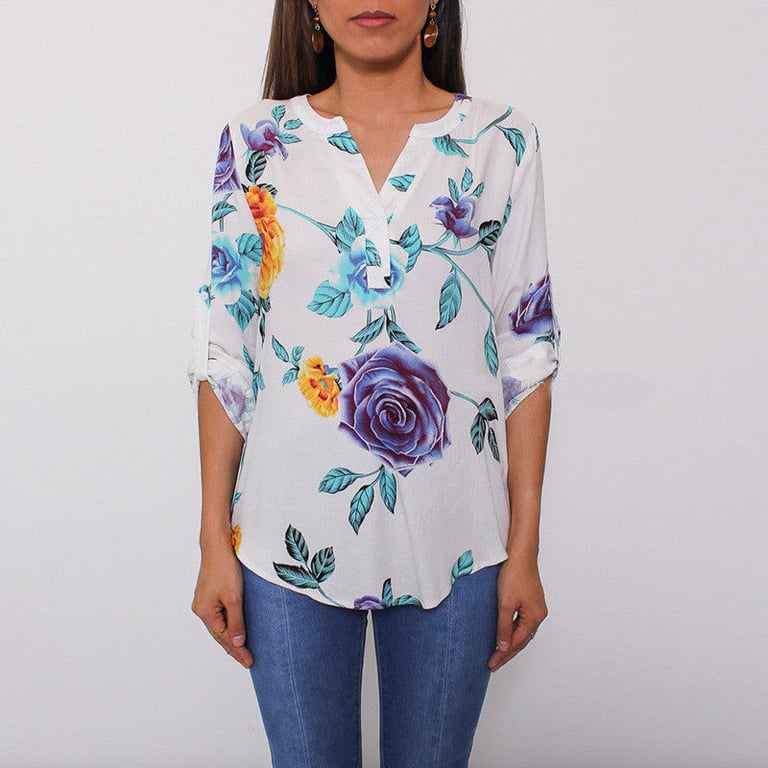 Blusa da donna a taglio libero con maniche lunghe. Le maniche possono essere arrotolate. La blusa ha un scollo a V e una stampa con fiori e foglie. Disponibile in diverse varianti.