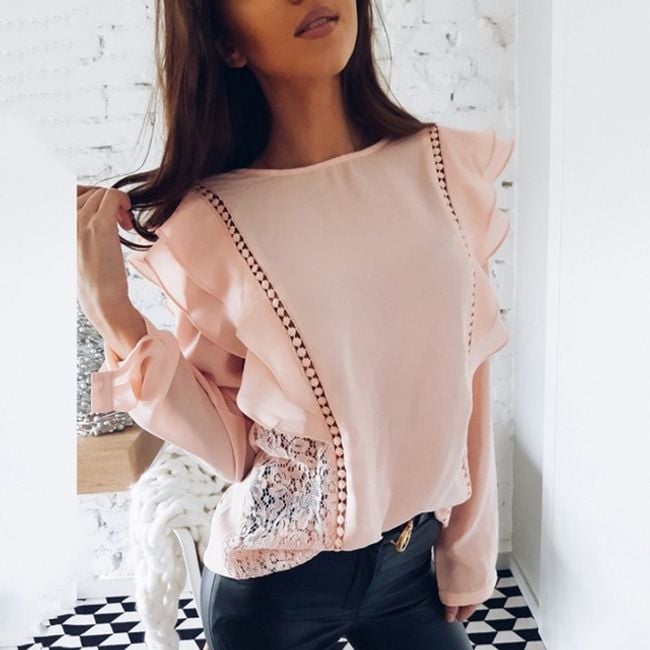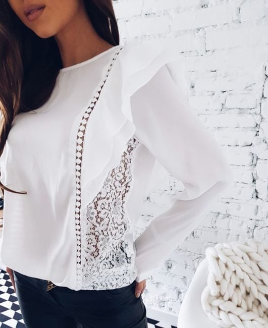 La blusa da donna a taglio libero ha maniche lunghe ed è decorata con pizzo trasparente sui lati. Sono disponibili 2 varianti di colore.