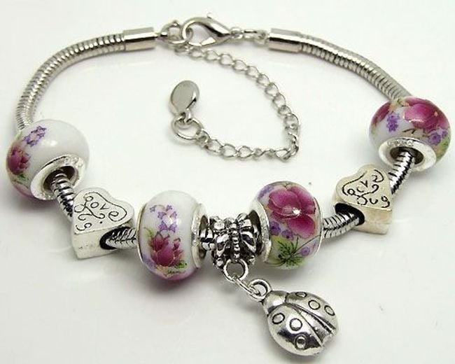 Nel bracciale troverete perline a forma di cuori, perline con fiori e una perlina pendente a forma di coccinella. La sua lunghezza può essere regolata grazie alla catena di estensione.