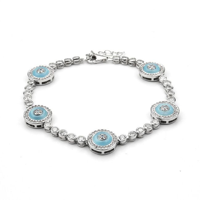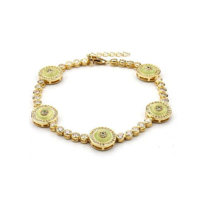 Offriamo un elegante bracciale, adatto sia per l'uso quotidiano che per occasioni speciali. È composto da cinque parti più grandi, decorate a colori. Queste parti sono collegate da parti più piccole, decorate con una piccola pietra trasparente. La chiusura è classica a gancio.
