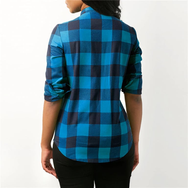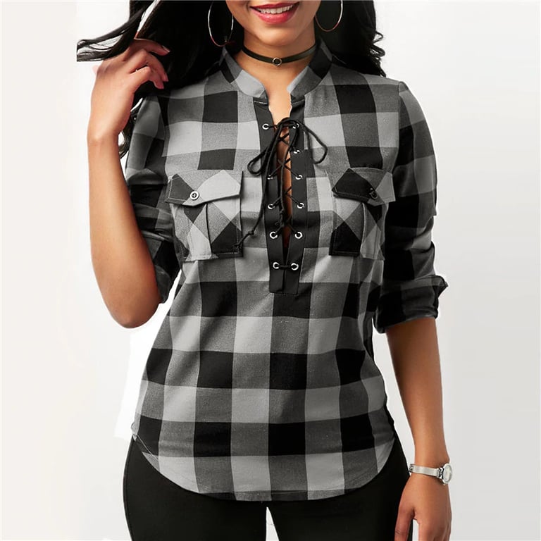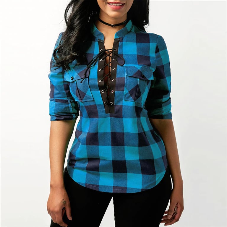 Camicia primaverile da donna, modello a quadri alla moda. Ha un profondo scollo a V con lacci.