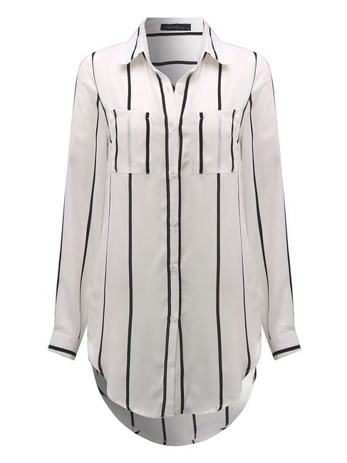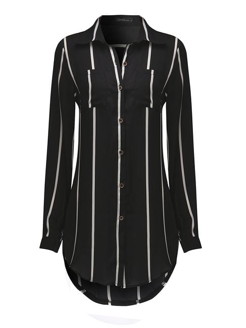 Questa camicetta può essere facilmente integrata nel tuo outfit elegante o casual. Le righe snelliscono otticamente e le tasche valorizzano il tuo décolleté. Scegli la taglia e anche il colore!