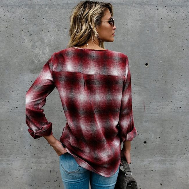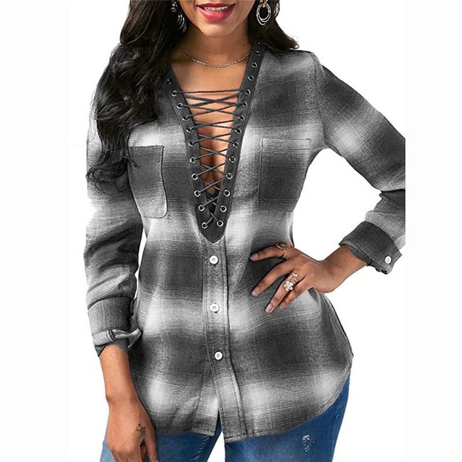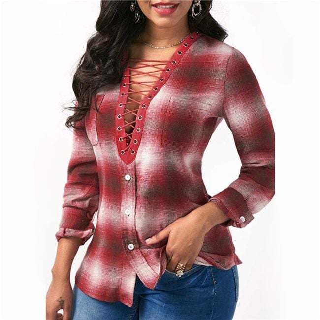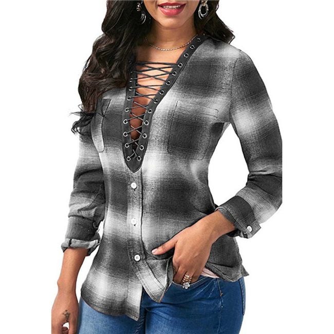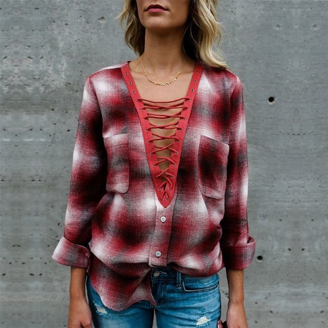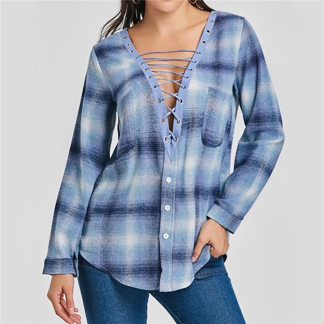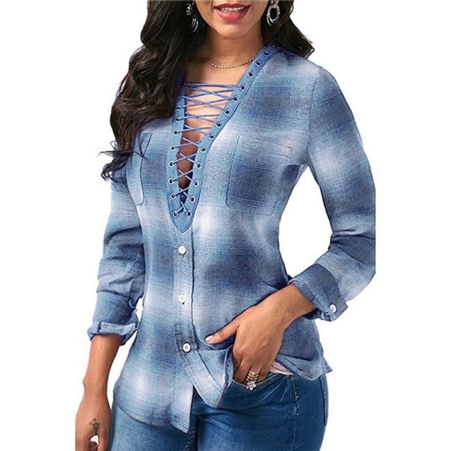 Questa camicia colpisce per il suo scollo interessante, che è riempito da lacci.