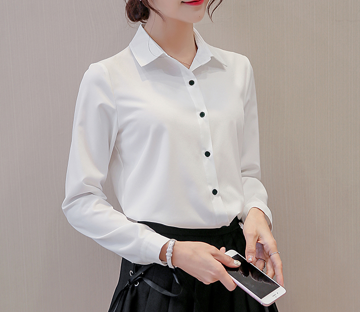 Camicia elegante da donna con maniche lunghe. Si chiude con bottoni e ha un collo a V.