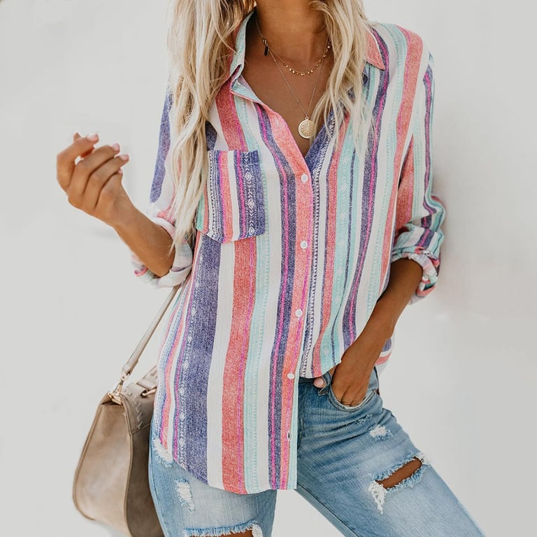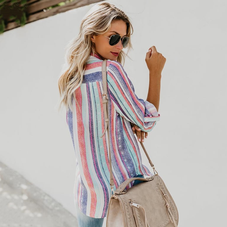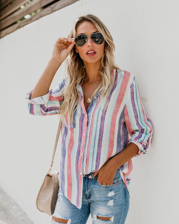 Camicia a righe da donna, colori estivi, taglio morbido. Ideale per la stagione estiva.