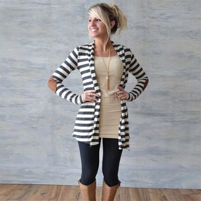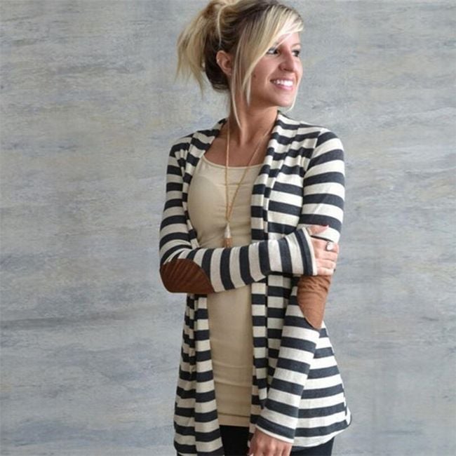 Il cardigan alla moda a righe ha toppe ovali cucite sui gomiti.