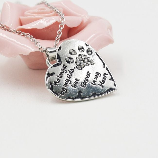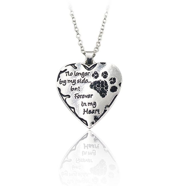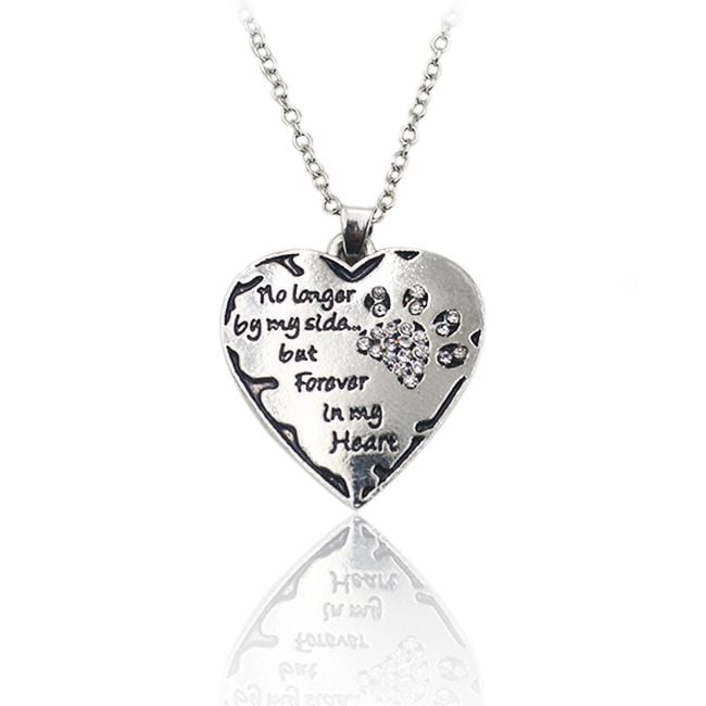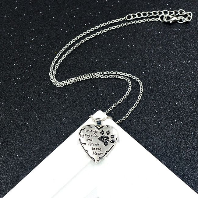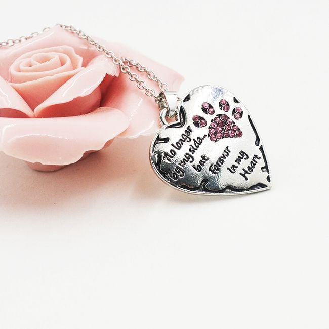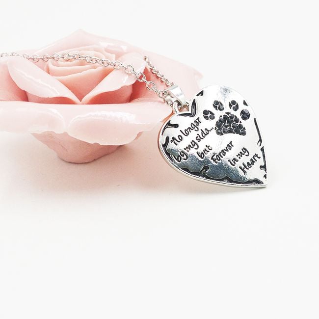 La collana con ciondolo a forma di cuore è dotata di una zampa composta da pietre in colori a scelta. Sulla superficie c'è la scritta in inglese "Non più al mio fianco, ma per sempre nel mio cuore." Questa collana può ricordarvi per sempre il vostro animale domestico.