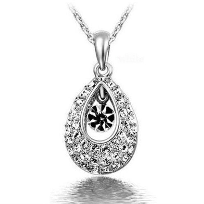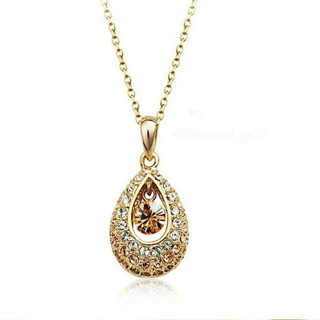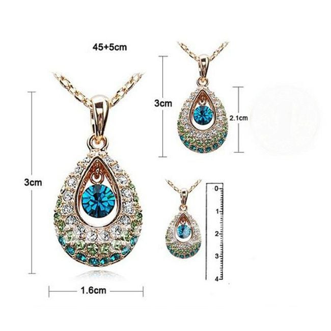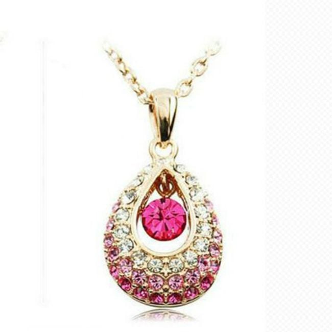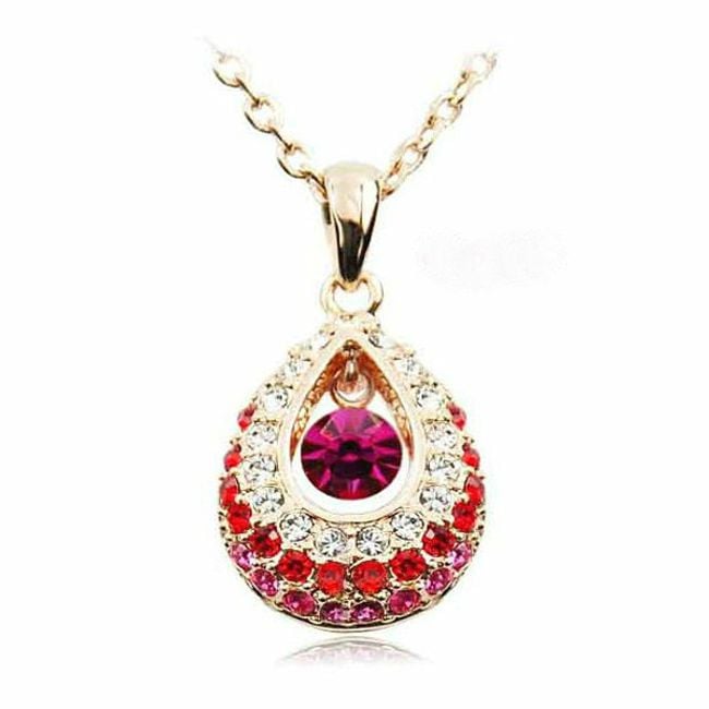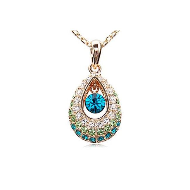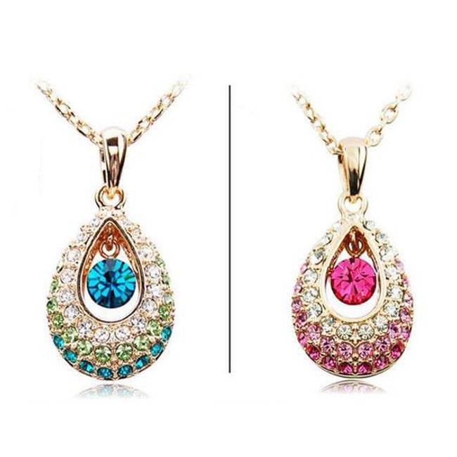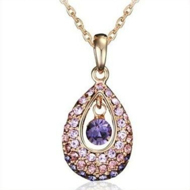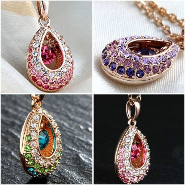 Un bellissimo collier con un ciondolo a forma di goccia è decorato con pietre colorate in vetro tagliato.