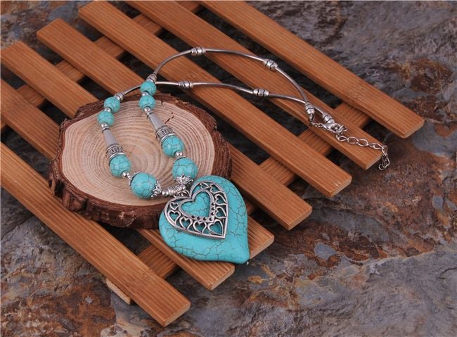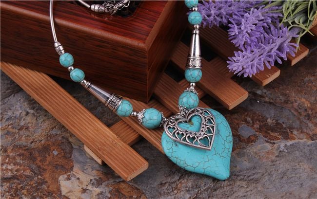 La collana è vistosa ed è decorata con un bellissimo ciondolo a forma di cuore.