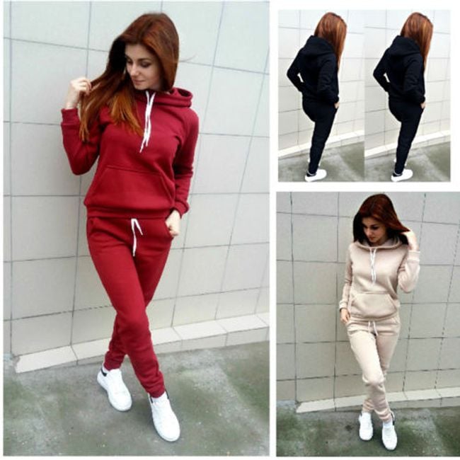 Adorerai questo originale completo da donna. La felpa è dotata di tasca frontale e cappuccio.