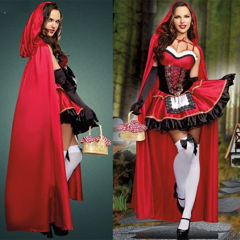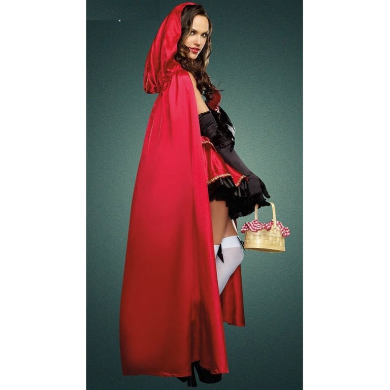 Costume da donna da favola rosso. Il set del costume include un vestito corsetto, un mantello rosso e guanti neri lunghi.