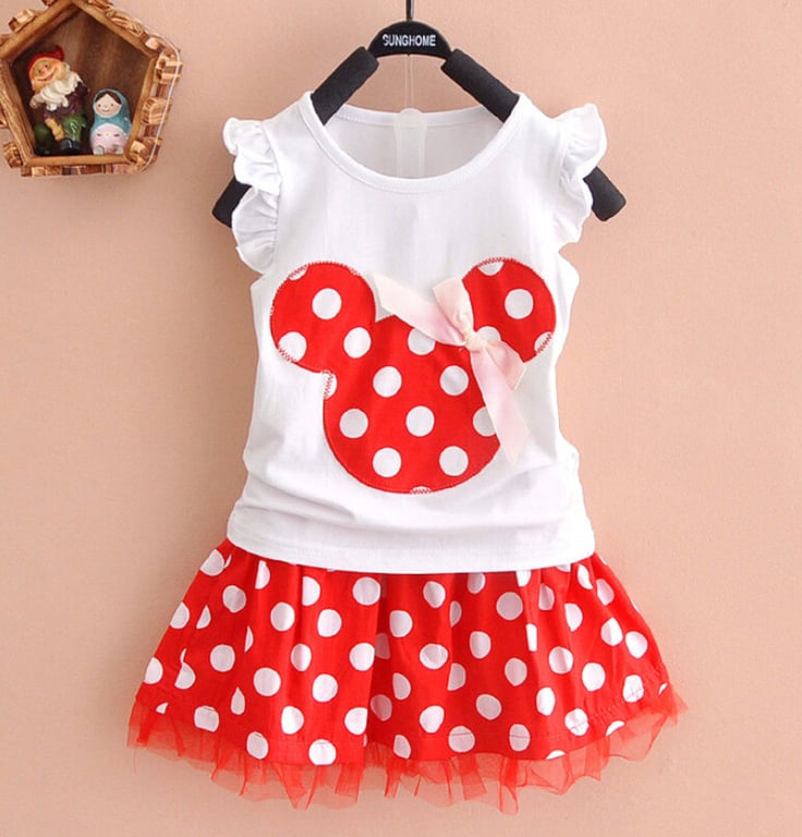 Delizioso set estivo a pois per ragazze – canotta con volant e gonna decorata con fiocco e stampa