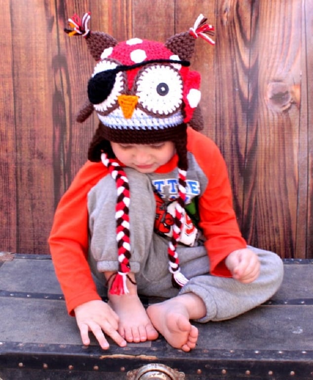 Bellissimo cappello all'uncinetto con orecchie e gufo pirata.