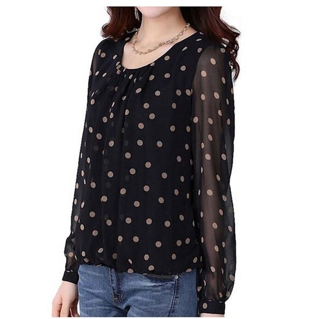 La blusa ha una linea molto elegante, è di colore nero ed è decorata con piccoli pois bianchi o color champagne.