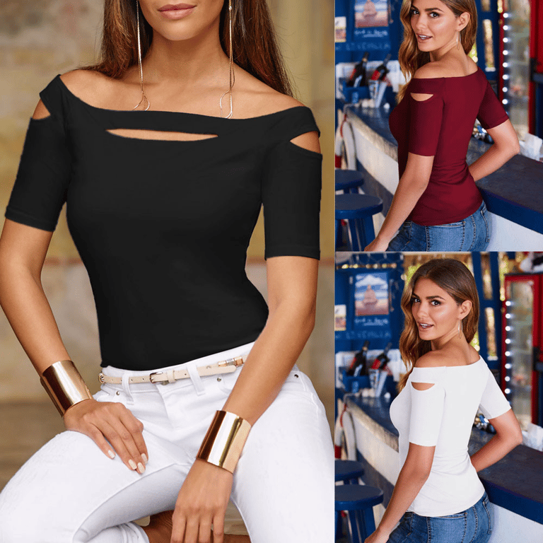 T-shirt da donna, in cui sarai bella ed elegante. Ha maniche corte e ritagli alla moda. Disponibile in tre colori.