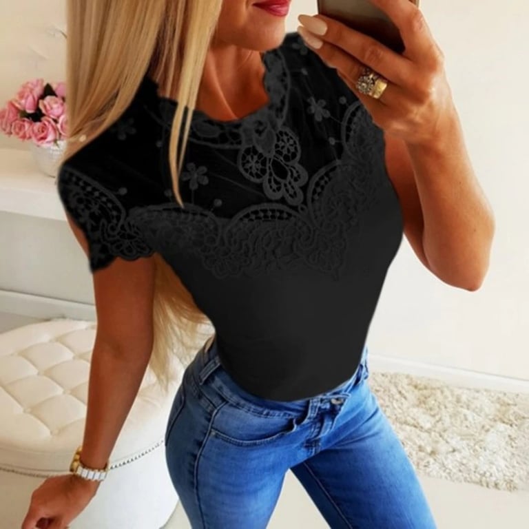 Bellissima t-shirt da donna con maniche corte. Taglio elegante grazie al delicato pizzo. Ideale per la primavera e l'estate.