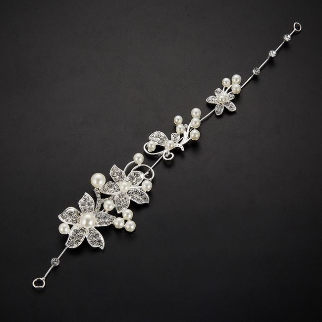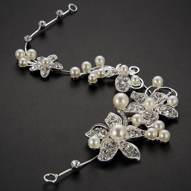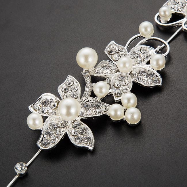 La fascia può essere piegata liberamente e può essere posizionata nei capelli come una fascia o avvolta intorno a un chignon, è decorata con pietre lucide e alcune perle artificiali.