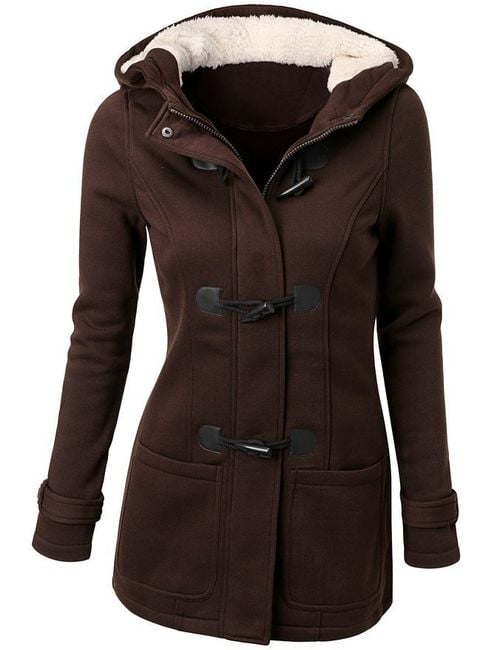 Il cappotto elegante da donna con cappuccio è dotato di un caldo pellicciotto. Scegli tra 4 varianti.
