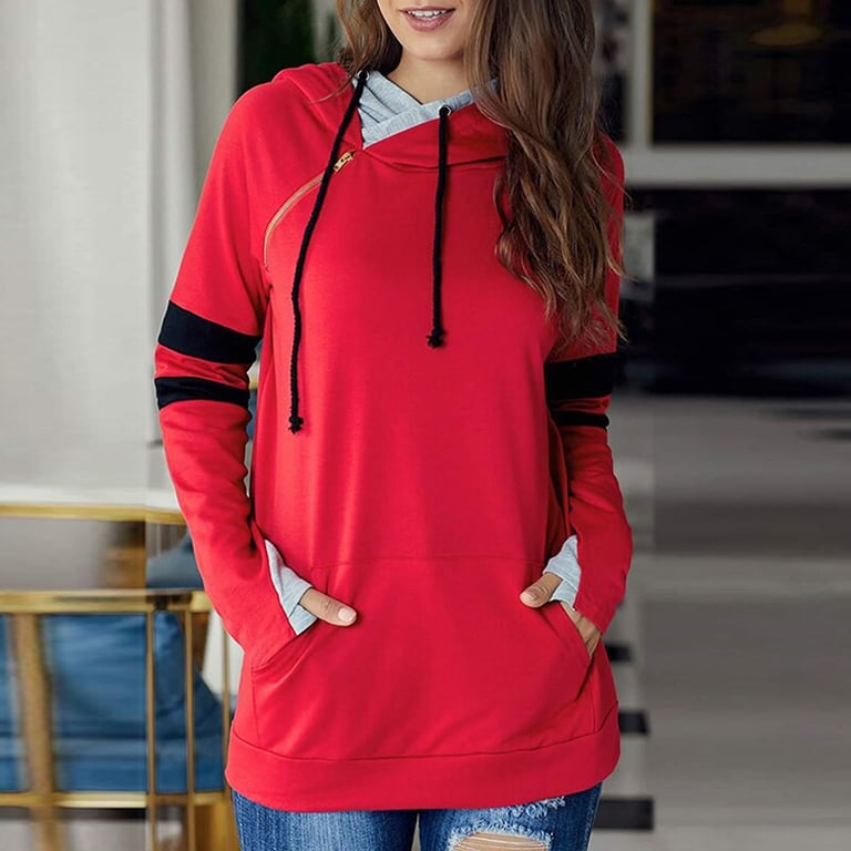 Felpa da donna con cappuccio. Taglio ampio con tasca a marsupio. Chiusura diagonale con zip. Maniche lunghe con dettaglio a righe. Disponibile in diverse varianti di colore.