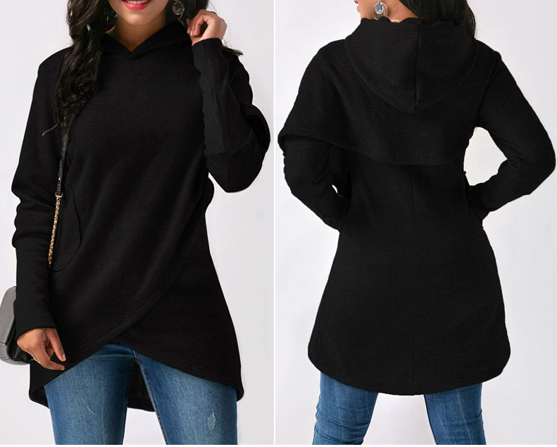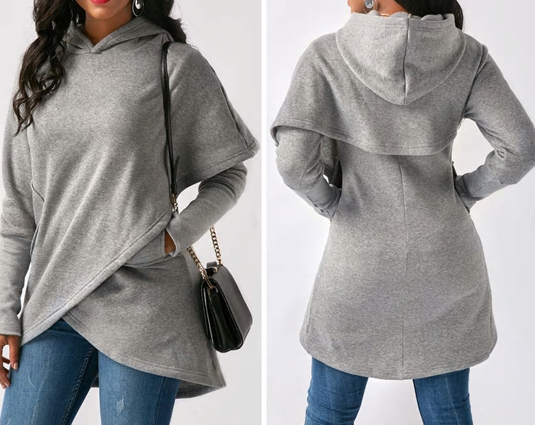 Bellissima felpa elegante con effetto avvolgente. Ha un cappuccio e una lunghezza maggiore. Ideale per la stagione primaverile.