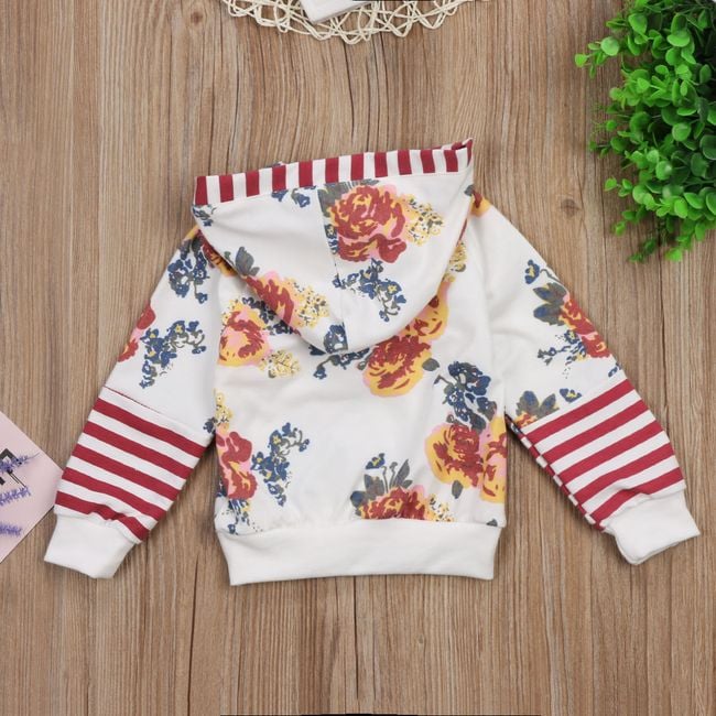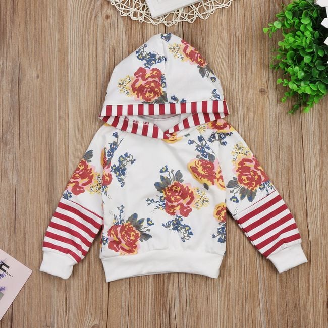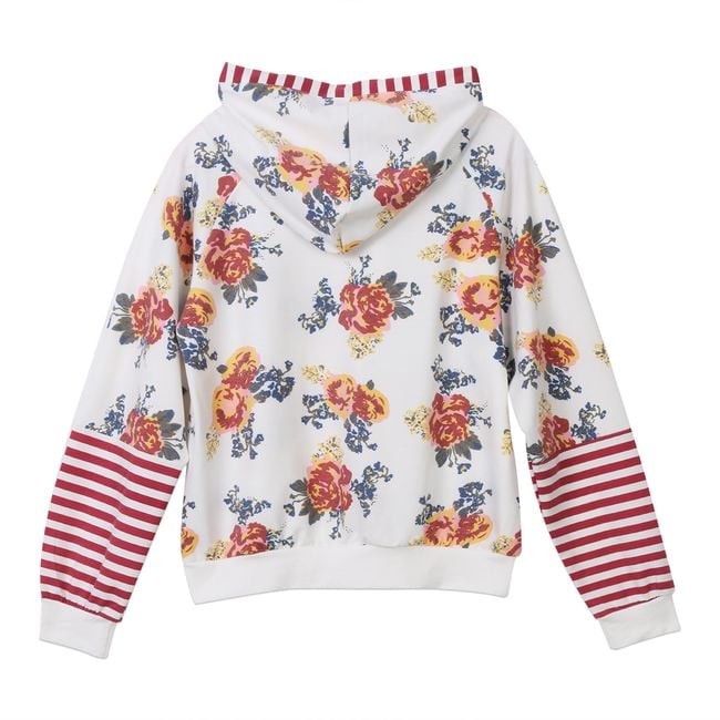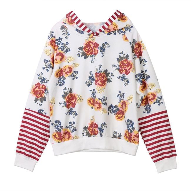 La felpa è di colore bianco, con maniche a righe e orlo sul cappuccio, e ha una bellissima stampa con rose. È adatta per l'uso quotidiano a scuola, al lavoro, ma apparirà meglio se indossata insieme.