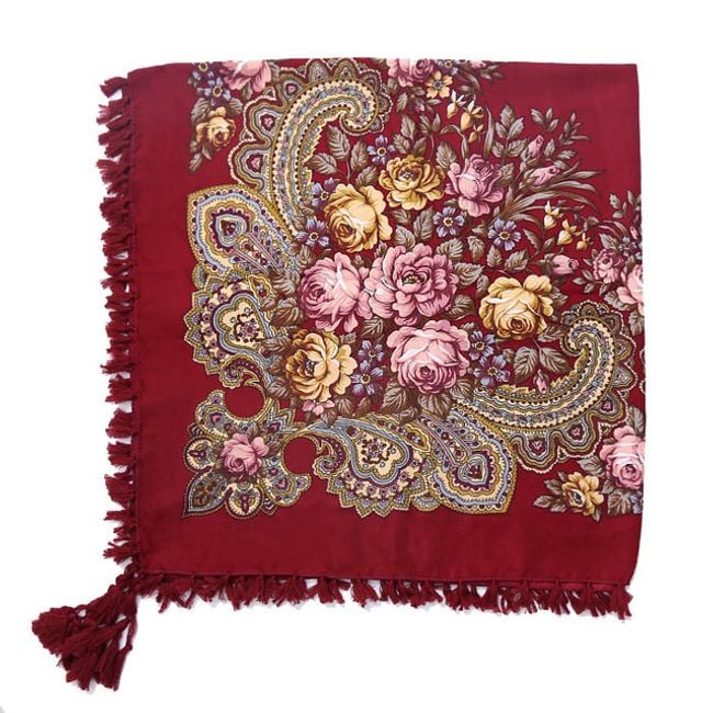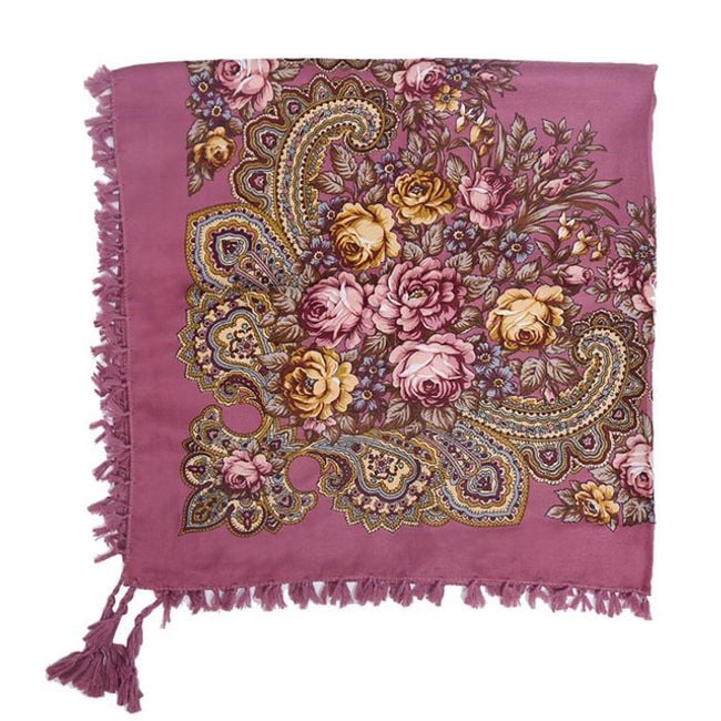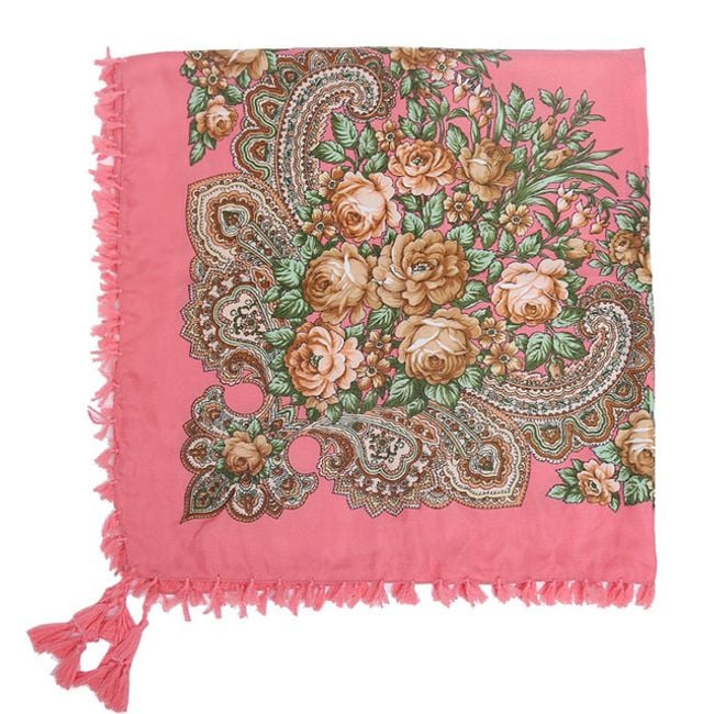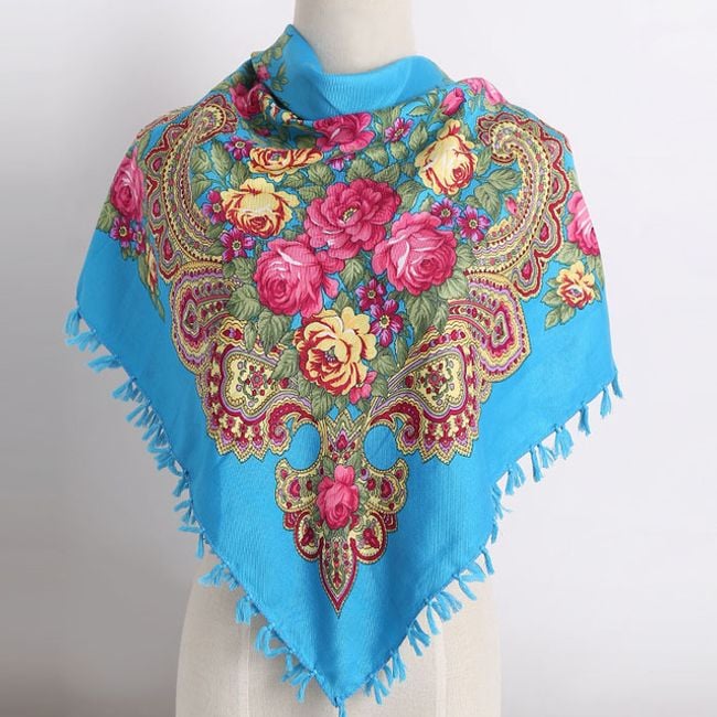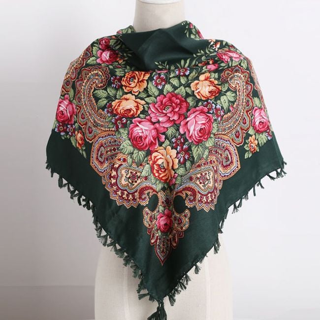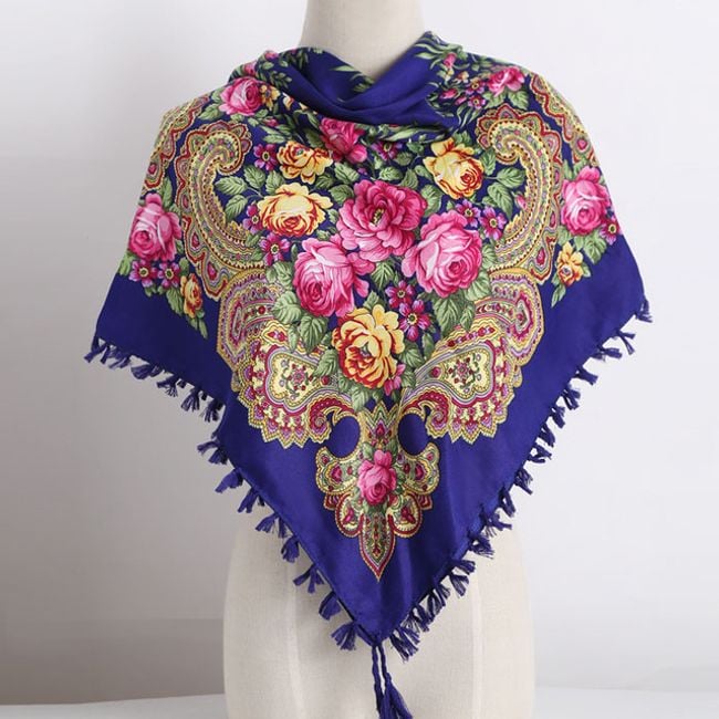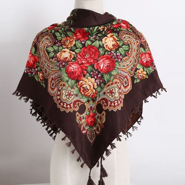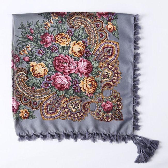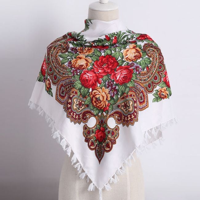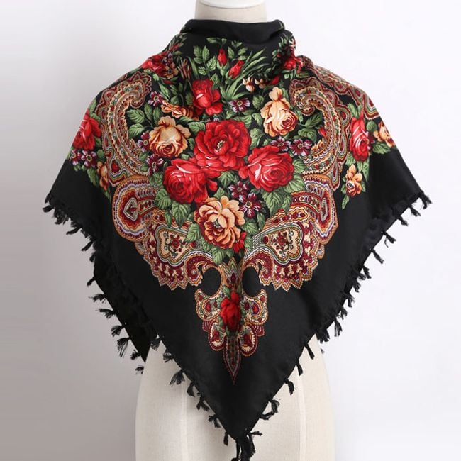 Il foulard con frange decorative ha un elegante motivo floreale.