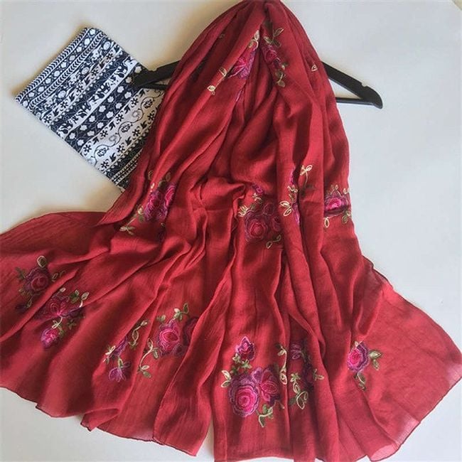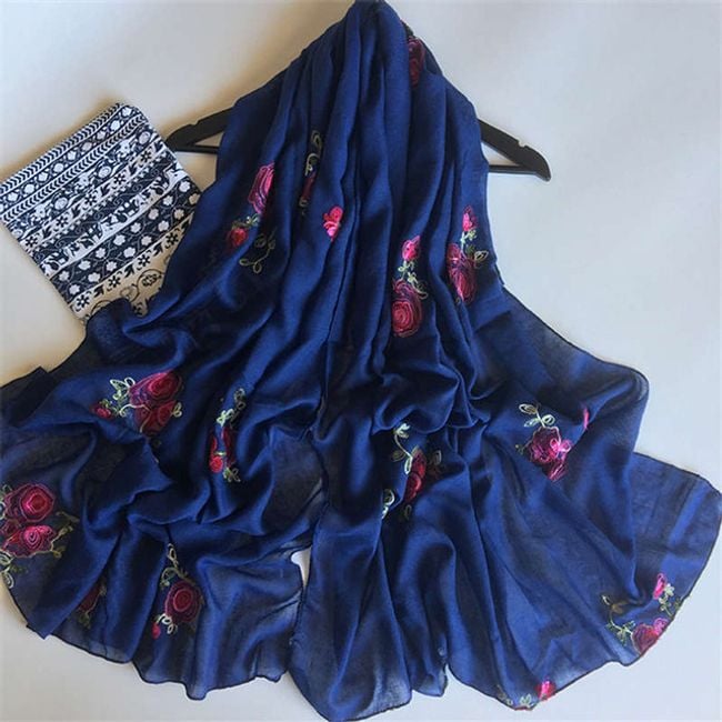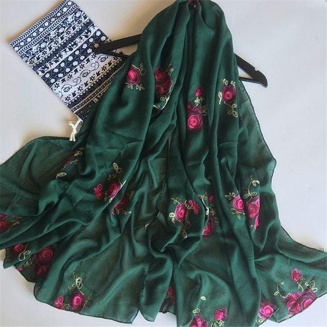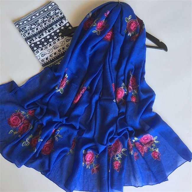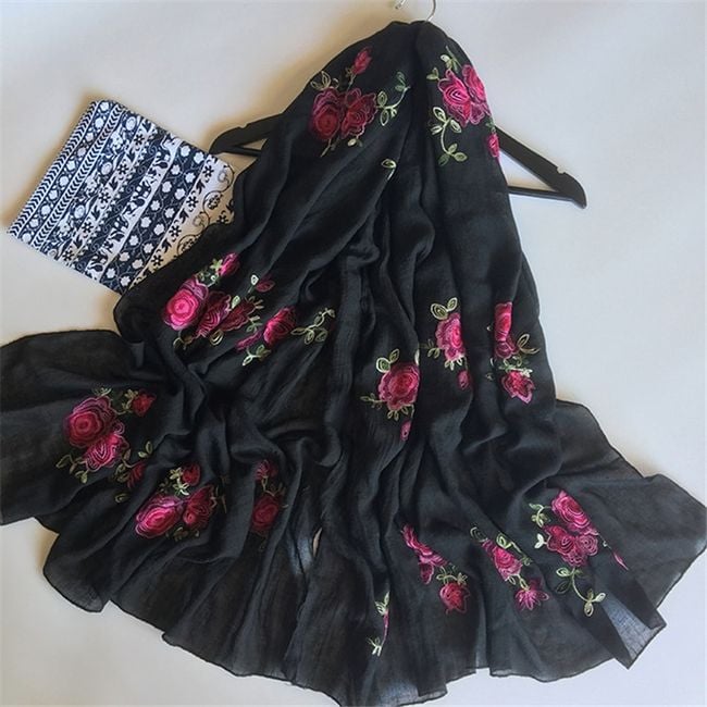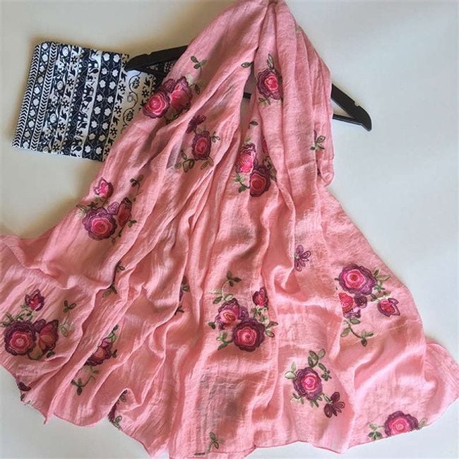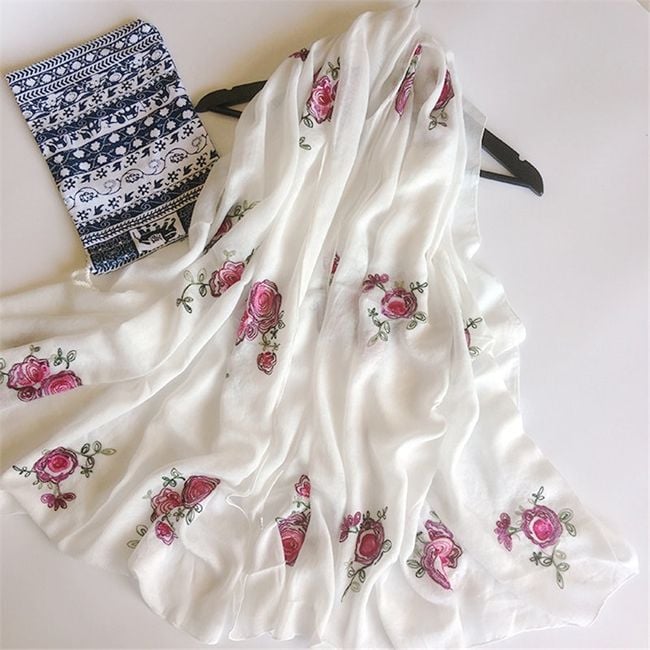 Il foulard ha un motivo di rose ed è ideale per ogni stagione.