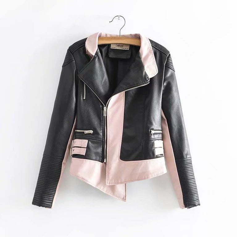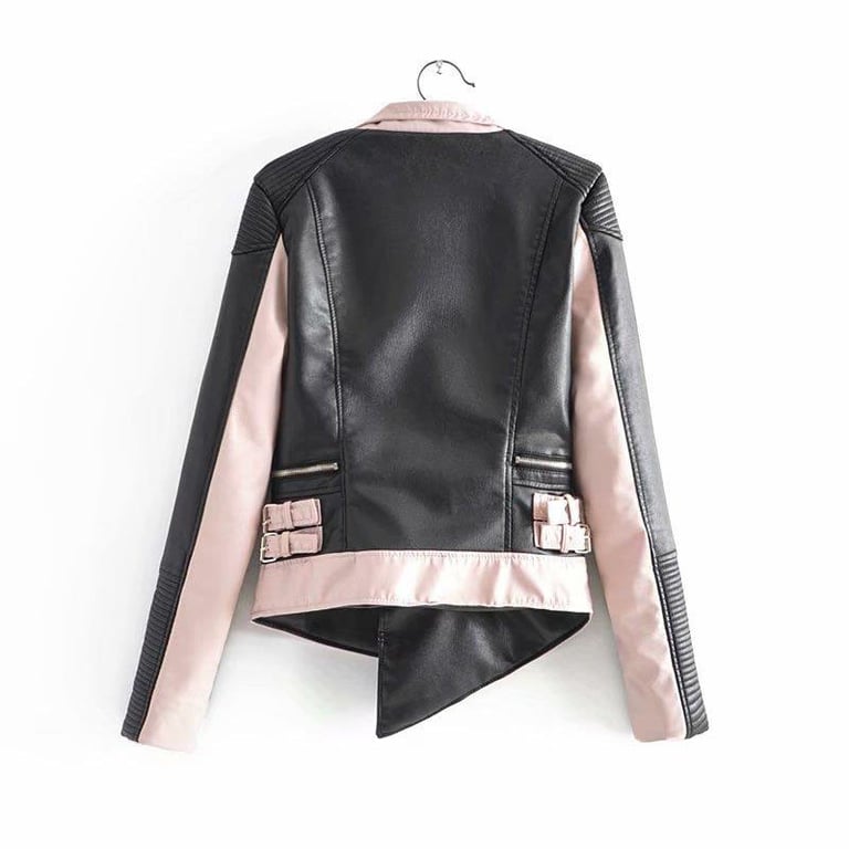 Giacca lucida con chiusura diagonale e taglio asimmetrico. Le fibbie decorative sono molto attraenti.