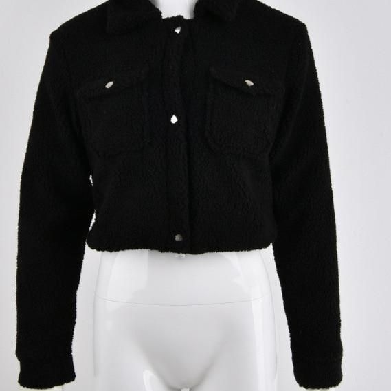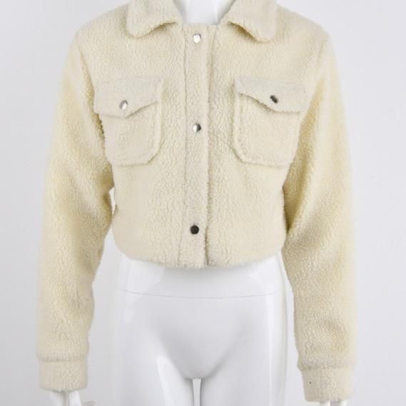 Giacca in pelliccia corta, elegante e bella, in beige e nero.