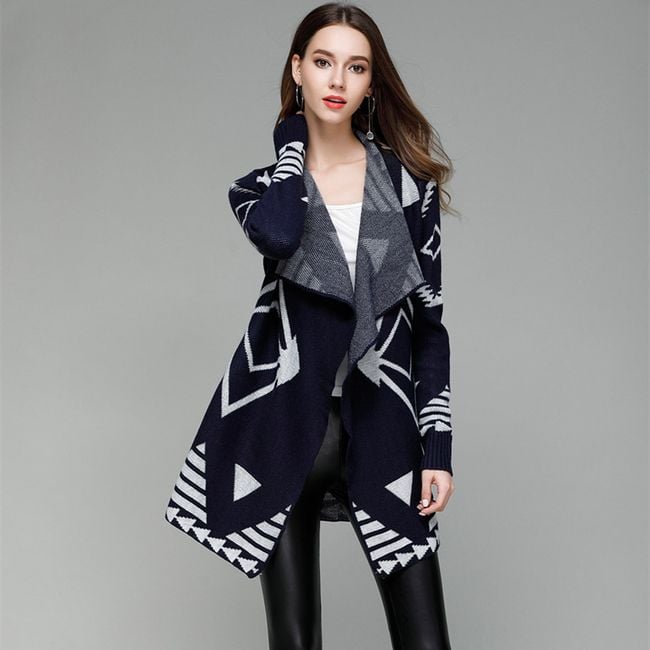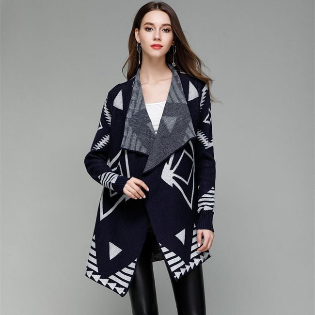 La giacca è di colore blu scuro ed è arricchita da un motivo geometrico bianco. Si adatta perfettamente all'uso quotidiano durante il tempo freddo, quando ti tiene molto stylish caldo.