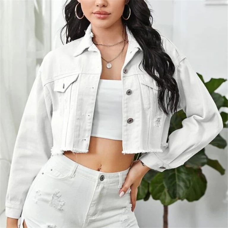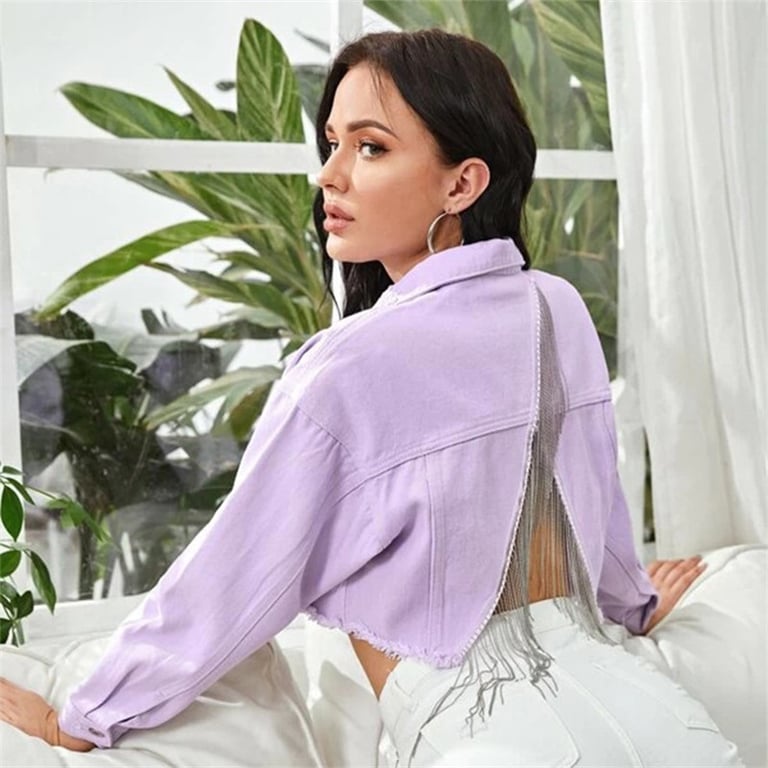 Giacca di jeans originale da donna corta con frange sulla schiena.
