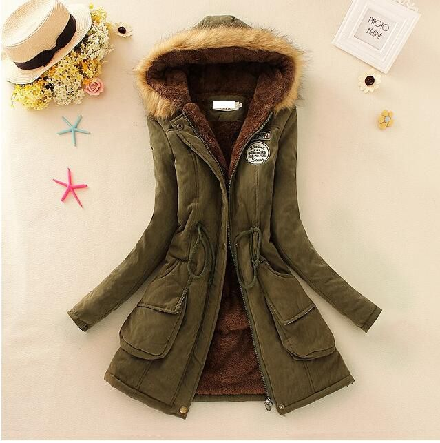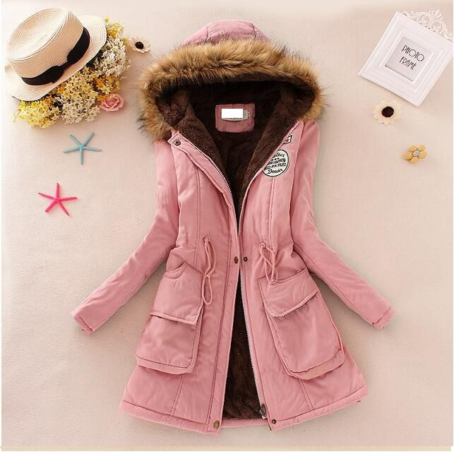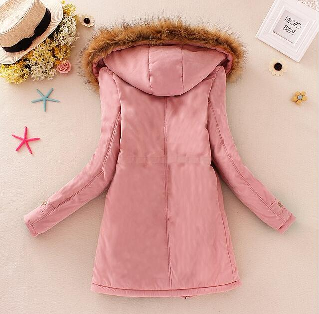 Giacca lunga da donna con cappuccio in pelliccia e grandi tasche. La giacca può essere stretta in vita e si chiude con una zip. Puoi scegliere tra diversi colori.