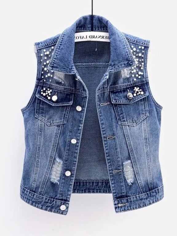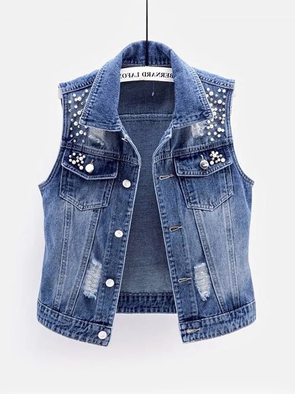 Gilet in denim da donna con perline e spacco