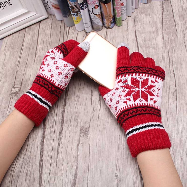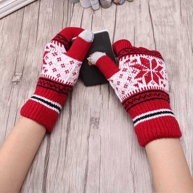 Guanti invernali da donna lavorati a maglia con motivo a fiocco di neve. I guanti hanno un materiale conduttivo sulle punte delle dita. Grazie a ciò, è possibile utilizzare gli schermi touch.