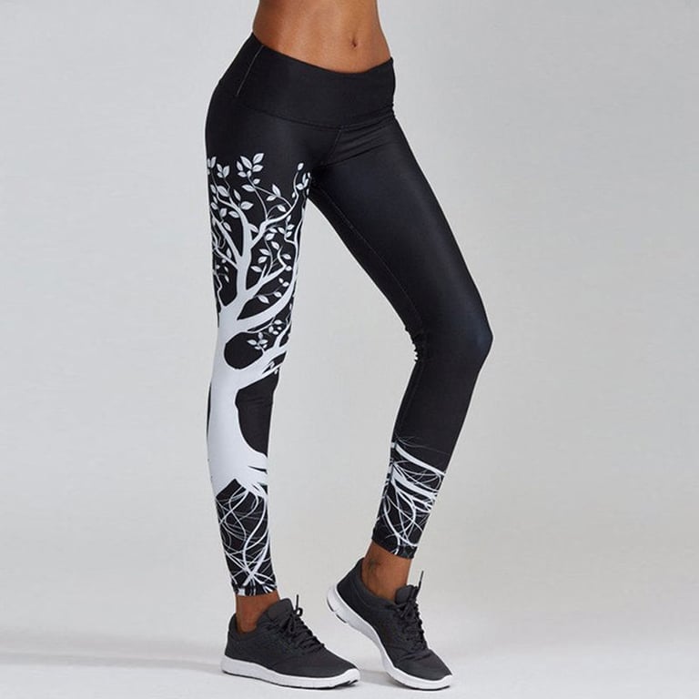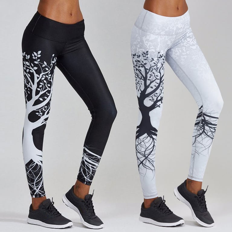 Leggings da donna con stampa dell'albero della vita. I leggings sono disponibili in bianco e nero con vita bassa. Adatti per l'uso quotidiano e per attività sportive.