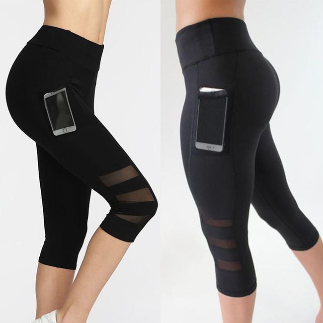 Leggings fitness stilosi da donna con tasca per il cellulare e taglio a tre quarti. Disponibili in colore nero.