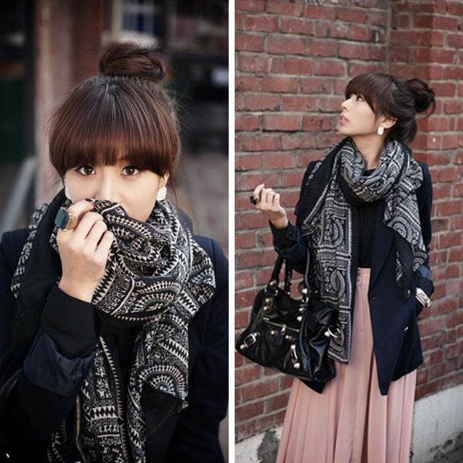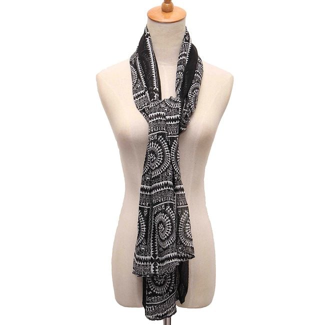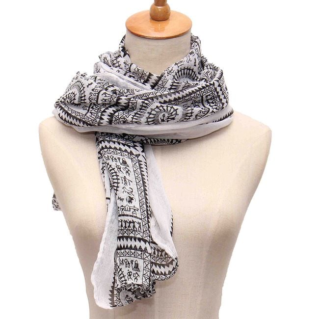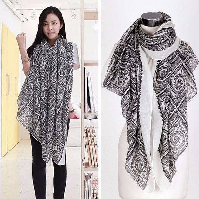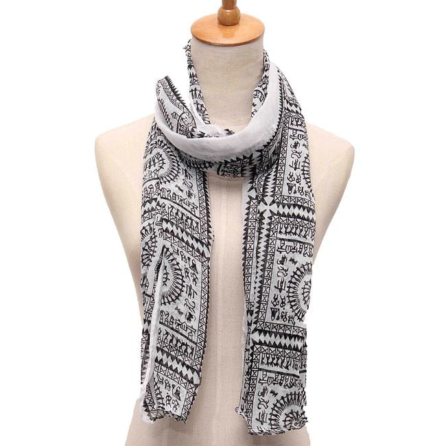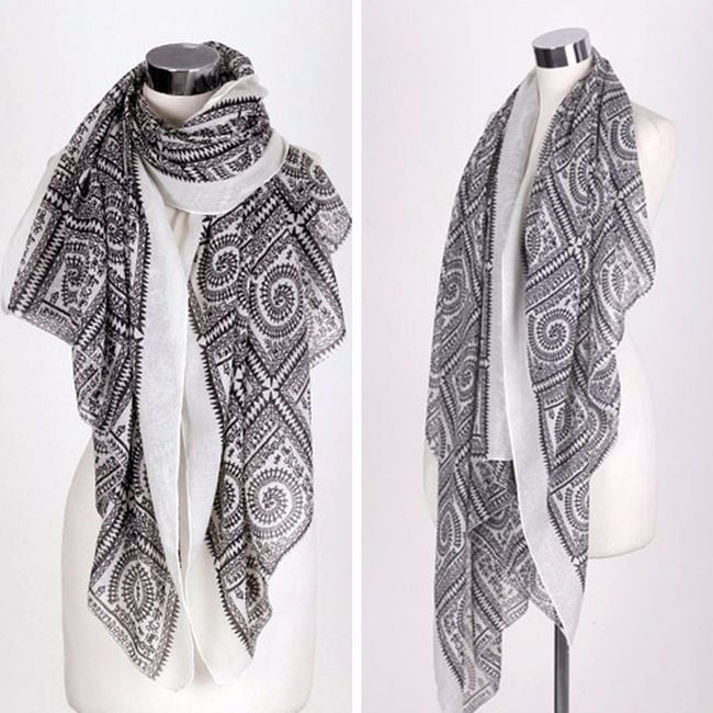 Un lungo scialle vintage con forme geometriche può essere indossato praticamente in ogni momento. È adatto per la primavera, l'autunno e l'inverno. Lo scialle è realizzato in un materiale piacevole che si indossa bene. Puoi scegliere tra diverse varianti di colore.