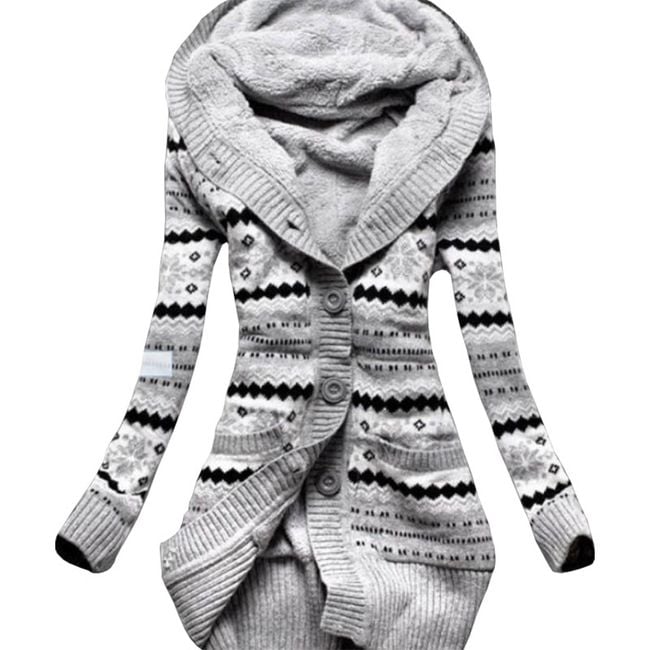 Il lungo maglione ha una fodera in pelliccia calda, tasche e cappuccio. Si chiude con bottoni. È disponibile in diverse taglie.