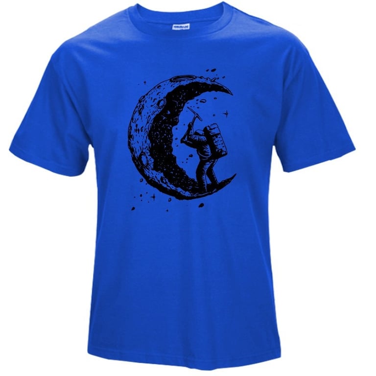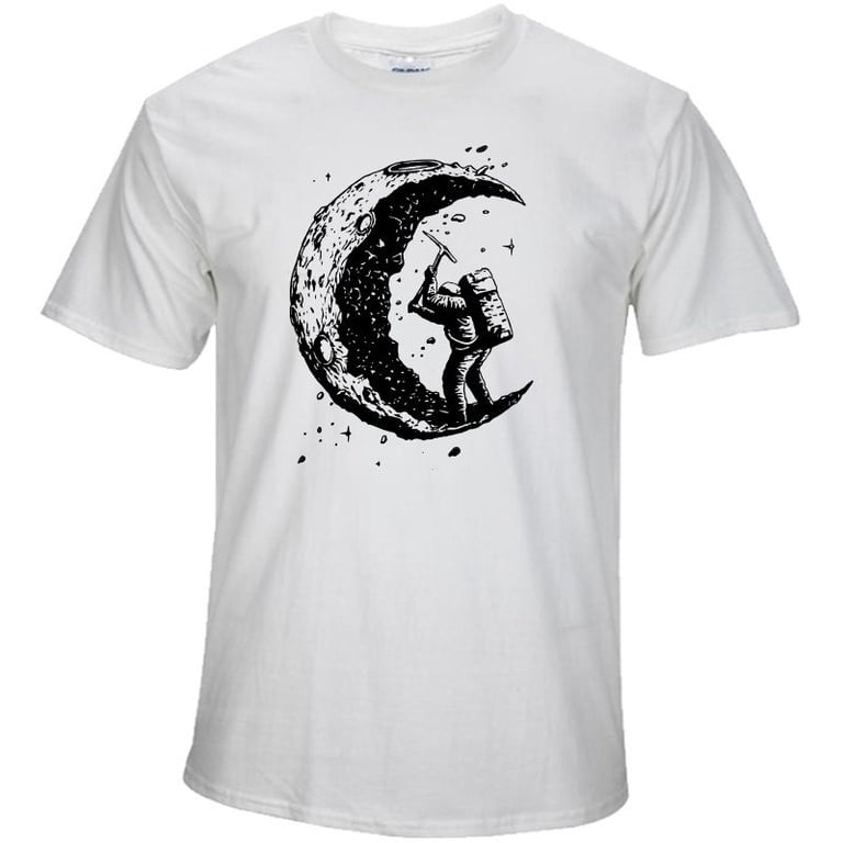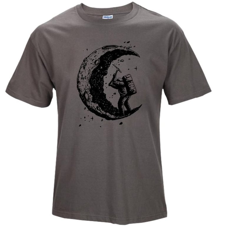 T-shirt da uomo a maniche corte con stampa nera di un astronauta che conquista la Luna. La maglietta è disponibile in diversi colori: grigio scuro, bianco, grigio chiaro, arancione, blu scuro, blu chiaro e crema.