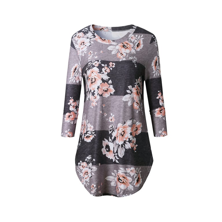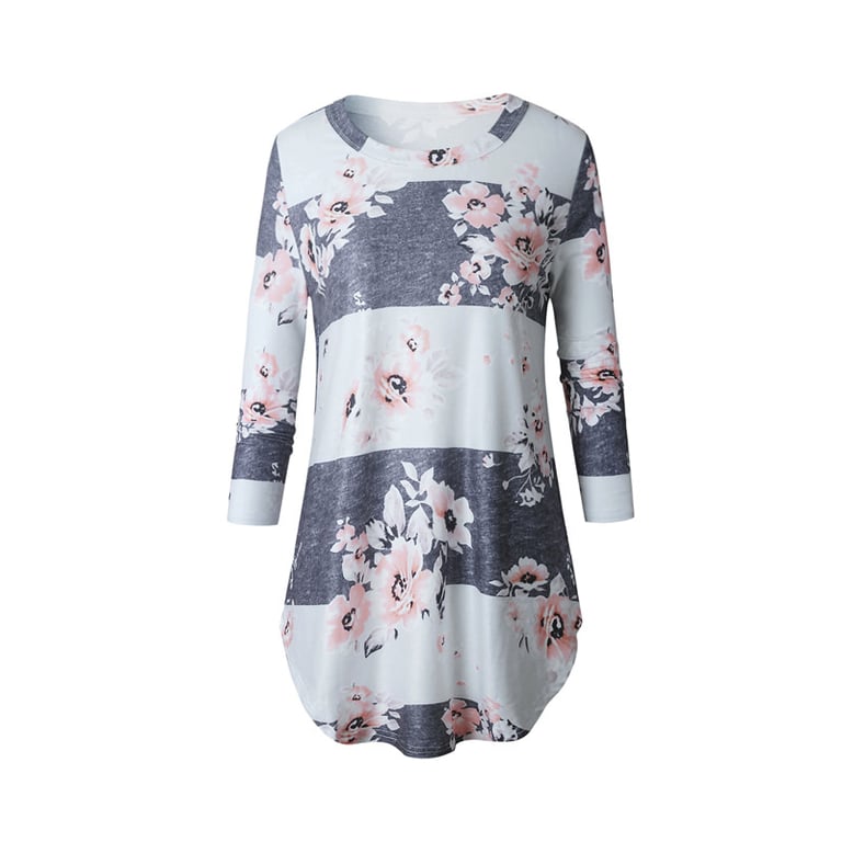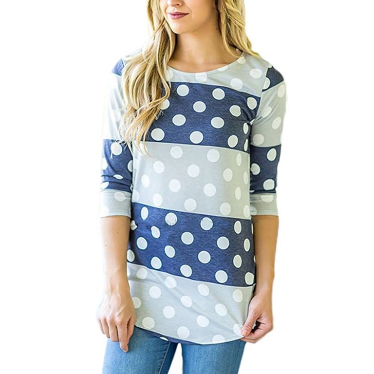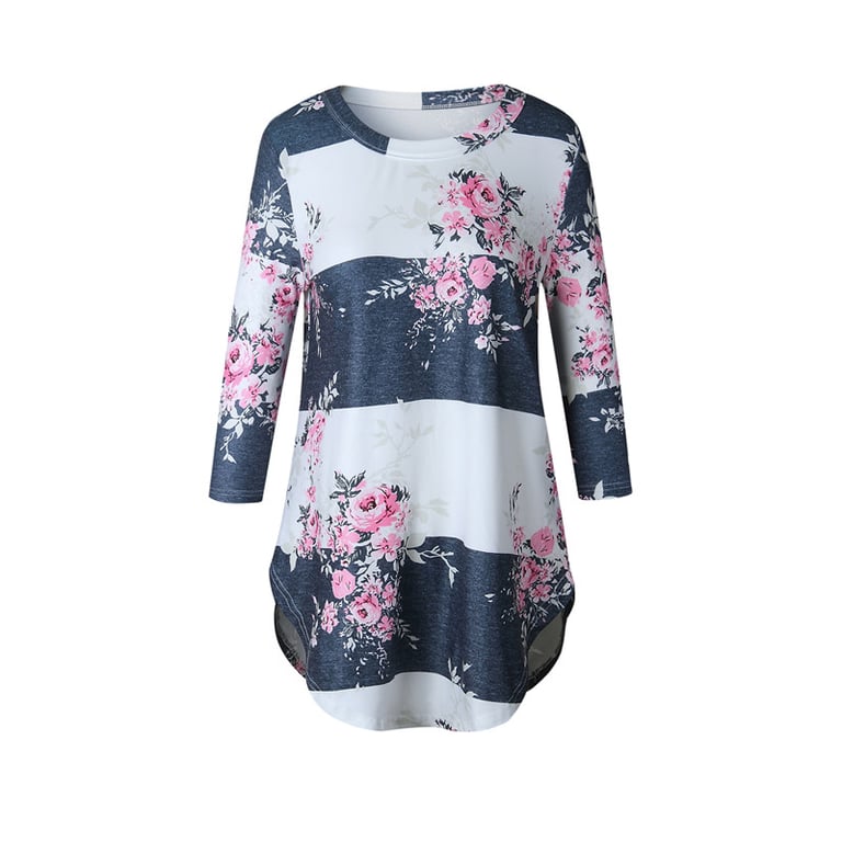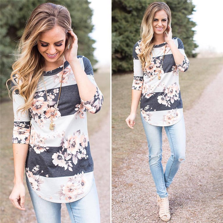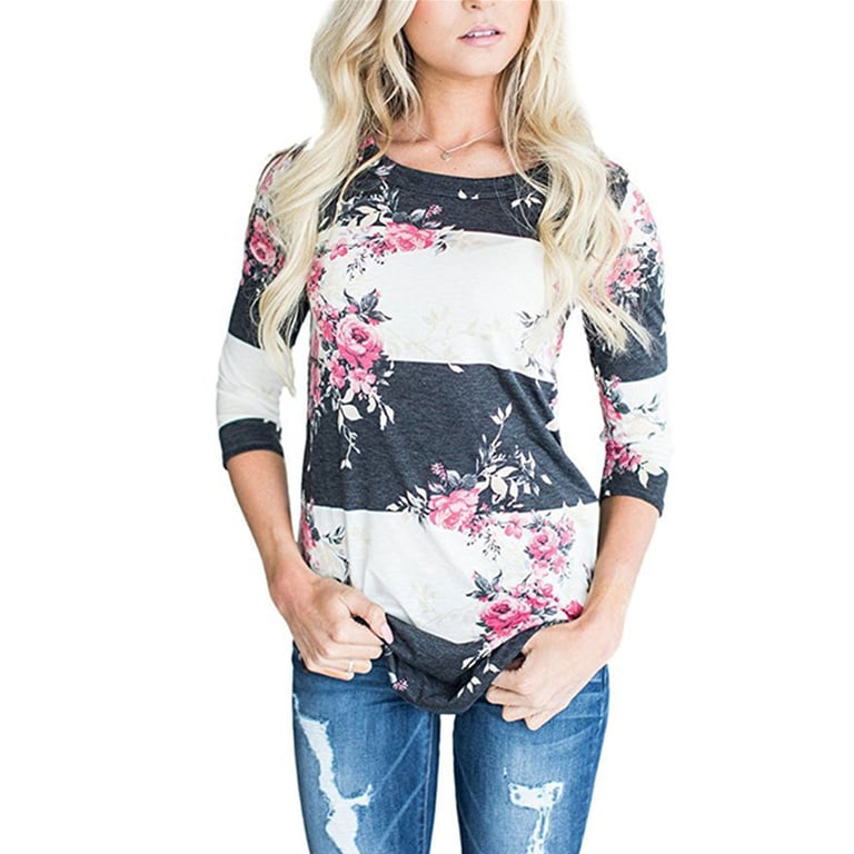 Maglietta a righe da donna con stampa di fiori e pois. Ha maniche 3/4 e scollatura rotonda. Ideale per il tempo libero.